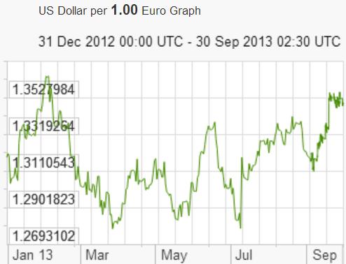 S-a scumpit şi moneda unică europeană, cu 1.5 lei, rata de schimb MDL/EUR fiind la sfârşitul lunii septembrie 2013 17.5 lei pentru 1 euro.