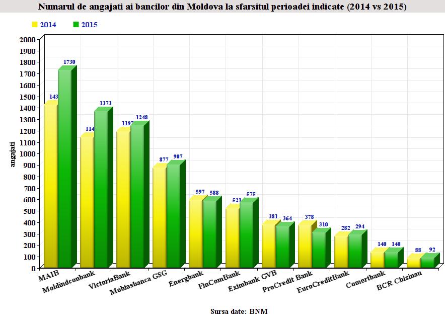 Cele 11 bănci rămase pe piață au plusat 582 locuri de muncă pe durata anului 2015. Cele mai mari majorări ale numărului de angajați se observă la MAIB (+300) și la Moldindconbank (+225). De cealaltă parte se poate menționa o diminuare cu 68 de angajați la ProCredit Bank, instituție financiară ce trece printr-un proces intern de restructurare/optimizare.