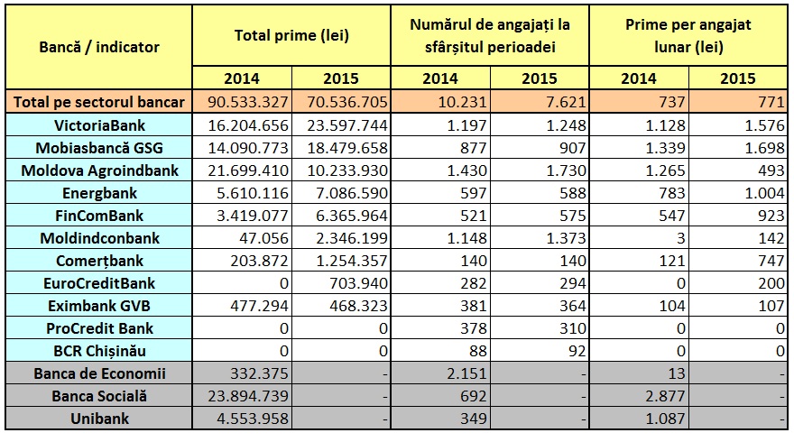 Băncile din Moldova au achitat în 2015 prime în valoare de 70,5 milioane lei. La acest capitol VictoriaBank deține întâietatea cu un fond de 23,6 milioane lei, urmează Mobiasbancă GSG (18,5 milioane lei) și Moldova Agroindbank (10,2 milioane lei).