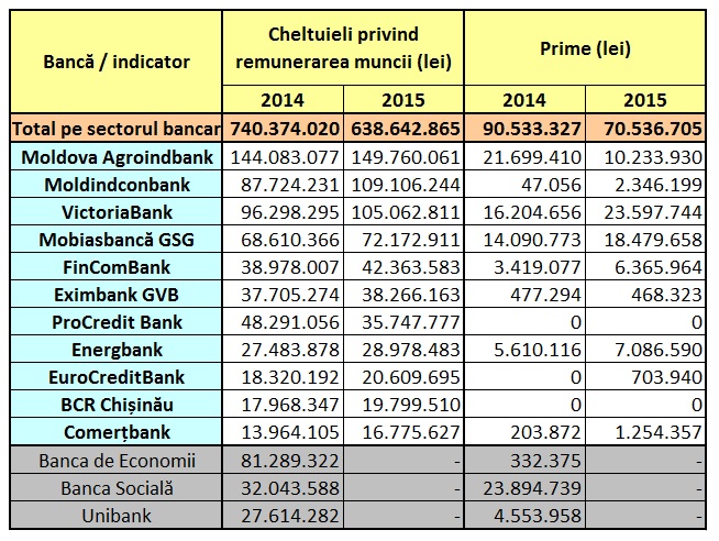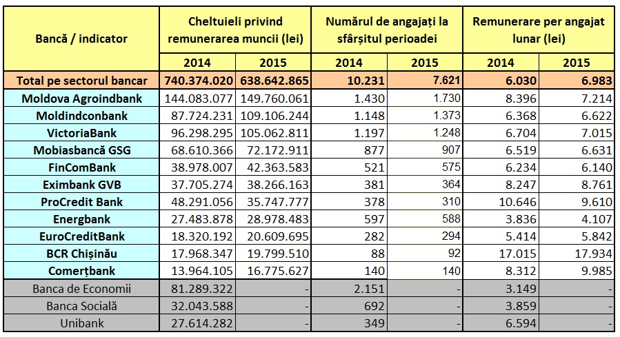 Cele mai mari cheltuieli privind remunerarea muncii în 2015 le-au efectuat Moldova Agroindbank (149,8 milioane lei), Moldindconbank (109,1 milioane lei) și VictoriaBank (105 milioane lei).