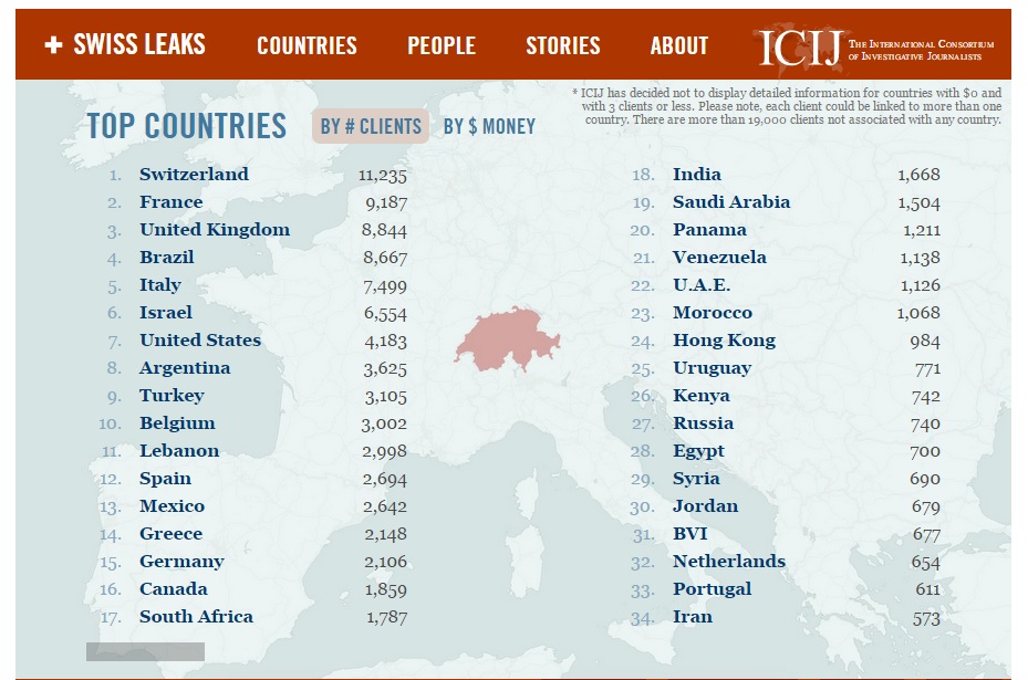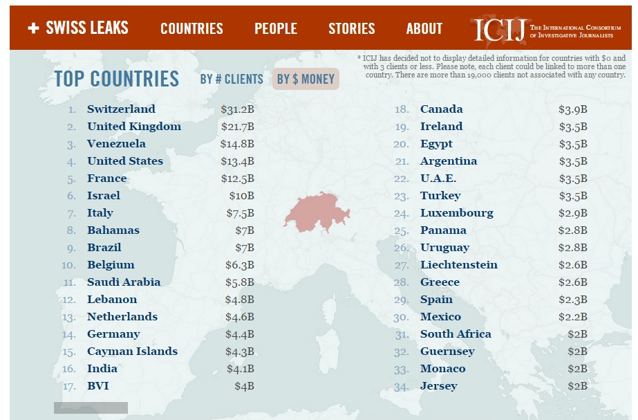 Potrivit unui raport publicat de International Consortium of Investigative Journalist (ICIJ), banca elveţiană a ajutat peste 100.000 de indivizi şi companii din 200 de ţări să eludeze fiscul, ascunzând identitatea deponenţilor, transmite Mediafax cu referire la Bloomberg.