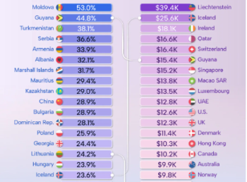 Republica Moldova este proiectată să înregistreze cea mai rapidă creștere a PIB-ului pe cap de locuitor din lume în perioada 2026–2030, cu un avans estimat la 53%, potrivit unei analize publicate de Visual Capitalist, pe baza proiecțiilor FMI.
