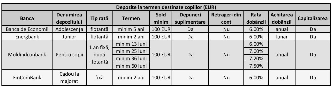În Republica Moldova băncile oferă 2 produse de economisire pentru copii: depozitele la termen și conturile de economii. Aceste produse pot fi în 3 valute: lei moldovenești, euro sau dolari americani.