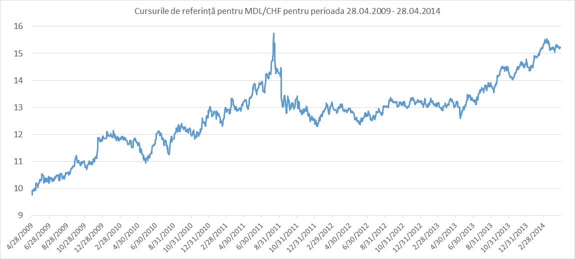 Francul elvețian nu este una dintre cele mai populare valute de pe piața valutară din Republica Moldova. La moment doar 4 bănci oferă posibilitatea de a face operațiuni valutare în numerar cu franci elvețieni. Analizând ultimii 5 ani, observăm că punctul minim al francului a fost înregistrat pe 29/4/2009 unde acesta valora 9,7697 lei, iar punctul maxim al francului în perioada analizată a fost înregistrat pe 11/8/2011 unde acesta valora 15,7455 lei. Una din cele mai importante fluctuații al cursului de referință MDL/CHF a avut loc în 2011 unde francul elvețian a fost supraapreciat, iar ca răspuns Banca Națională a Elveției a decis să deprecieze valută pentru că creșterea bruscă al valorii francului a început să devină o amenințare pentru economia Elveției. De la începutul anului 2012 valoarea francului a început ușor să crească, după care începând cu anul 2013 francul a crescut rapid cu aproximativ 3 lei. Vedeți în continuare graficul cu evoluția cursului de referință al leului moldovenesc față de francul elvețian.