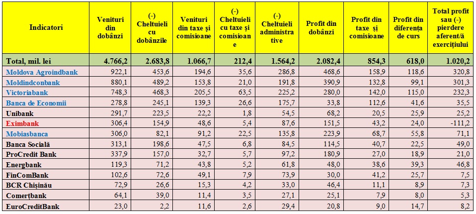 Potrivit datelor din anul 2013, top 4 bănci care au obținut cele mai consistente profituri sunt și cele care au cele mai mari profituri din dobânzi. Este vorba despre Moldova-Agroindbank, Moldindconbank, Victoriabank și Mobiasbancă. Totuși, profitul aferent ratelor de dobândă nu decide neapărat rezultatul financiar al băncii. În acest context, menționăm că Eximbank, singura bancă ce a înregistrat pierderi financiare în anul 2013, a avut un profit din dobânzi destul de semnificativ, ocupând locul 6 în topul calculat după acest indicator.