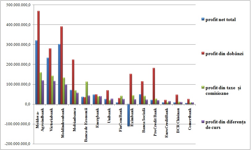 Din graficul de mai sus, se poate remarca faptul că la capitolul profit din taxe și comisioane și profit din diferența de curs, aceleași 4 bănci – Moldova-Agroindbank, Moldindconbank, Victoriabank și Mobiasbancă – au intrat în top, fiind însoțite și de Banca de Economii. Aceasta din urmă a realizat în anul 2013 un profit din taxe și comisioane în sumă de 112,6 mil. lei sau de 4 ori mai mult decât profitul înregistrat din dobânzi, devansând Mobiasbancă. În ce privește profitul aferent operațiunilor de schimb valutar al Băncii de Economii, acesta s-a ridicat în anul 2013 la 41,6 mil. lei.